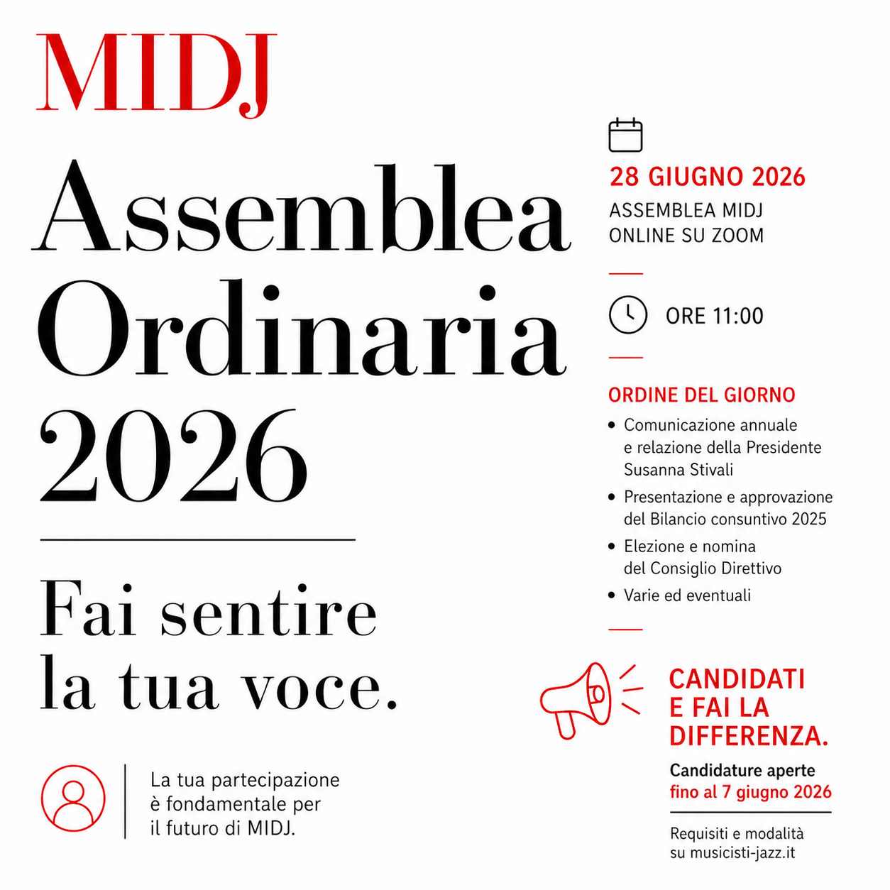 Midj, Associazione Musicisti Italiani di Jazz, nasce l’8 marzo 2014 per costituire il punto di riferimento dei musicisti di Jazz in Italia e con l’esigenza primaria individuare specifiche politiche di sostegno per il jazz e per le musiche d’improvvisazione.